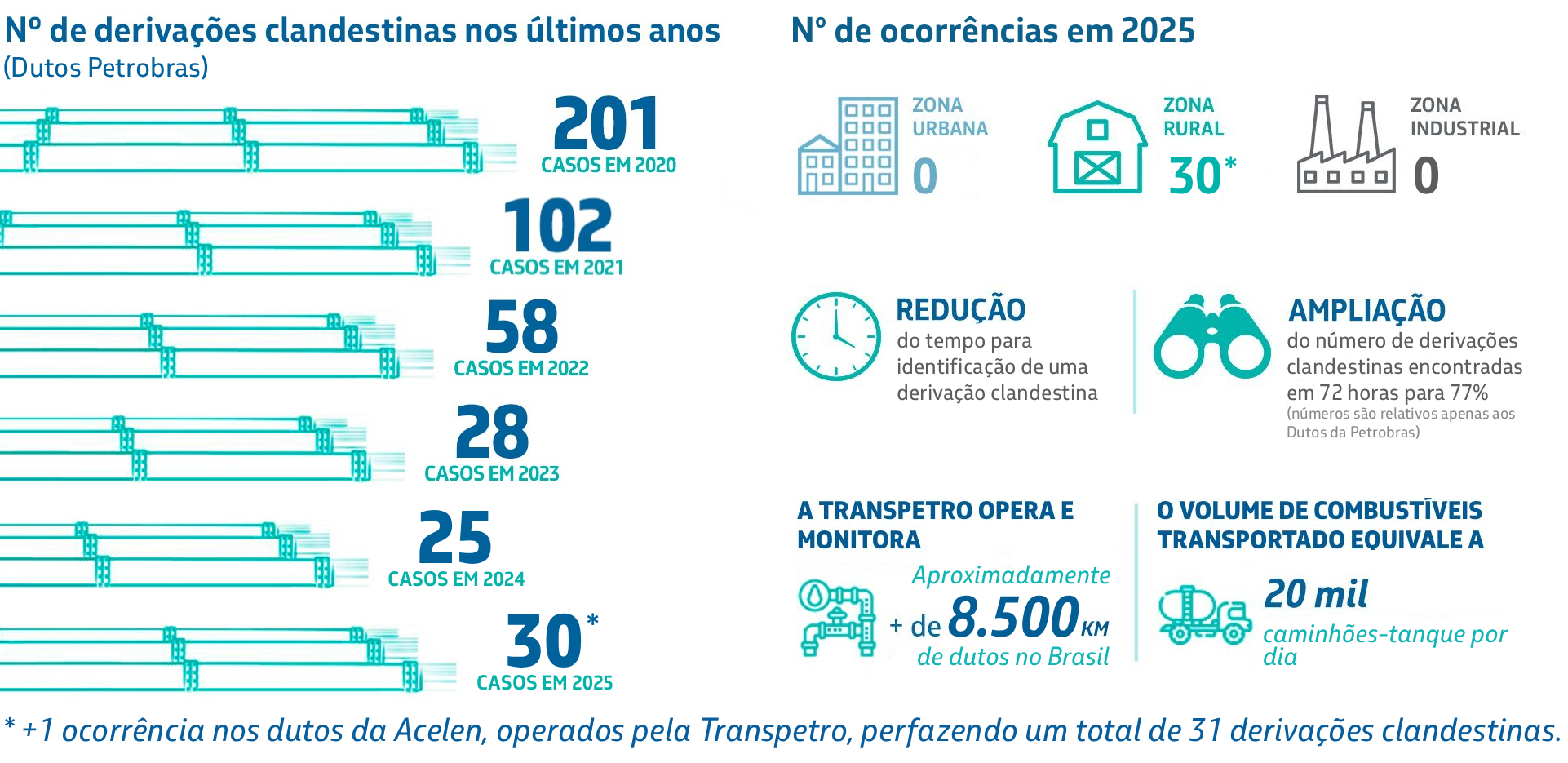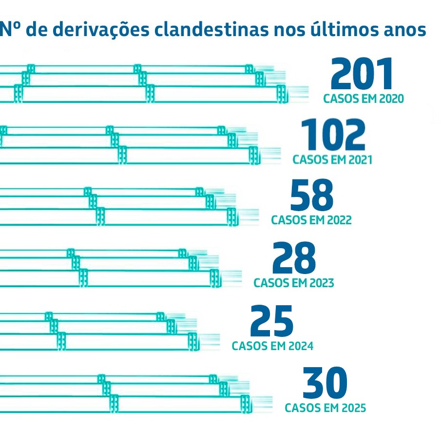 São ações clandestinas de roubo de óleo e derivados diretamente dos nossos dutos. Nossa maior preocupação é a segurança das pessoas e do meio ambiente. As derivações clandestinas trazem riscos de vazamentos, incêndios e explosões.