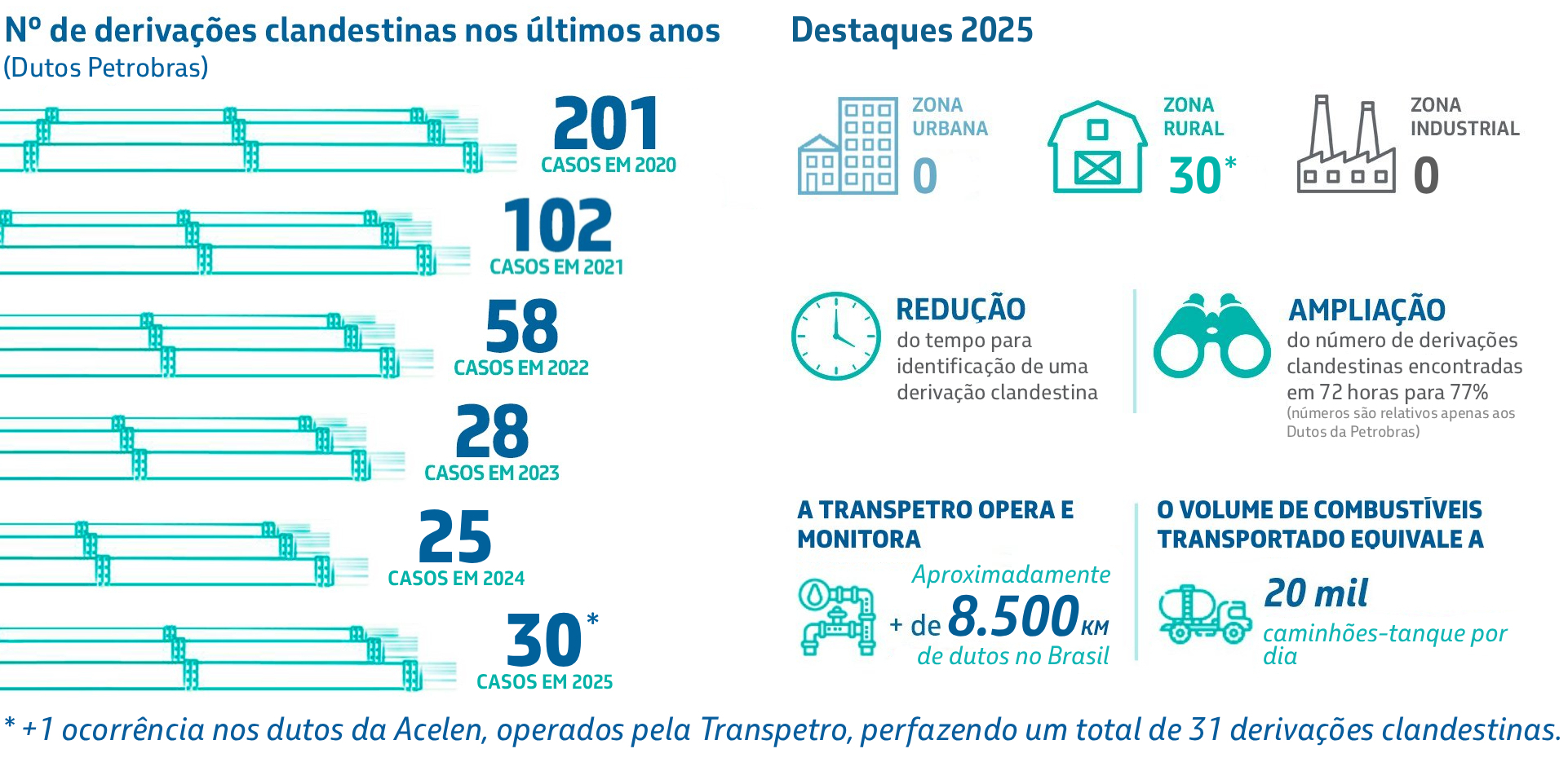 São ações clandestinas de roubo de óleo e derivados diretamente dos nossos dutos. Nossa maior preocupação é a segurança das pessoas e do meio ambiente. As derivações clandestinas trazem riscos de vazamentos, incêndios e explosões.